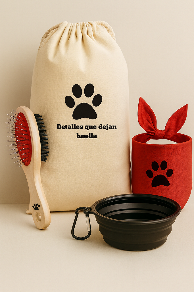 Kit de Bienvenida para Mascotas – “Detalles que dejan huella” | Bolsa Personalizable, Cepillo, Pañuelo y Cuenco Plegable
